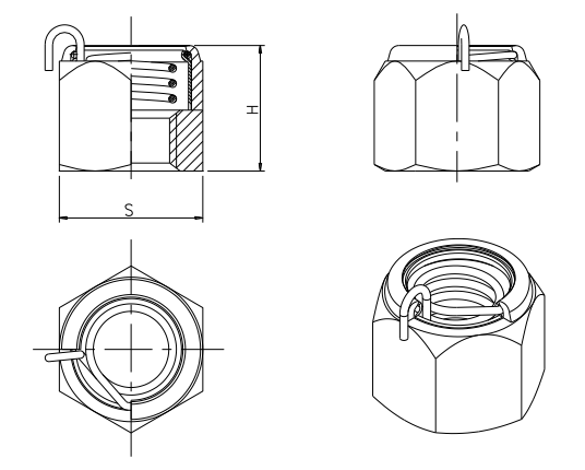 弹簧嵌件式防松螺母使用弹簧的张紧特征,,,,,,,,在较小紧固力矩或无力矩状态依然具有优异的防松性能,,,,,,,,经?1200?次横向振动试验后剩余轴力不低于?70%。。。。。弹簧螺母本体材质为?304B?优质奥氏体不锈钢,,,,,,,,性能品级为?A2-70,,,,,,,,螺纹接纳可靠防咬死工艺处置惩罚。。。。。