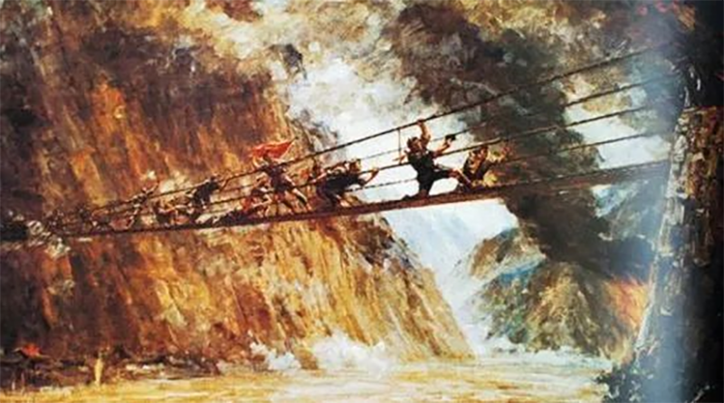 侦探完地形、敌情之后,,,,,团里连忙组织选拔突击队员。。。。。。。突击队由第二连22名共产党员和起劲分子组成,,,,,连长廖大珠为队长。。。。。。。下昼4时,,,,,总攻最先。。。。。。。团向导在桥头指挥战斗。。。。。。。司号员一齐吹响了冲锋号,,,,,全团所有武器一齐向对岸开火,,,,,一时间军号声、枪声、喊杀声震撼山谷。。。。。。。突击队员们每人手持冲锋枪或手枪,,,,,背插大刀,,,,,腰缠12颗手榴弹,,,,,在队长的率领下冒着仇人的弹雨,,,,,踏着铁索,,,,,勇猛向对岸冲去。。。。。。。紧跟厥后的是王友才连长率领的第3连,,,,,他们除了携带武器外,,,,,每人还夹着一块木板,,,,,边铺桥边冲锋。。。。。。。